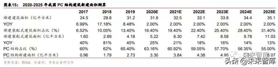 通过以上假设,我们可以测算出 20/25 年 PC 结构建筑新建面积 3.30/6.07 亿平米,20-25 年 CAGR+14.2%。